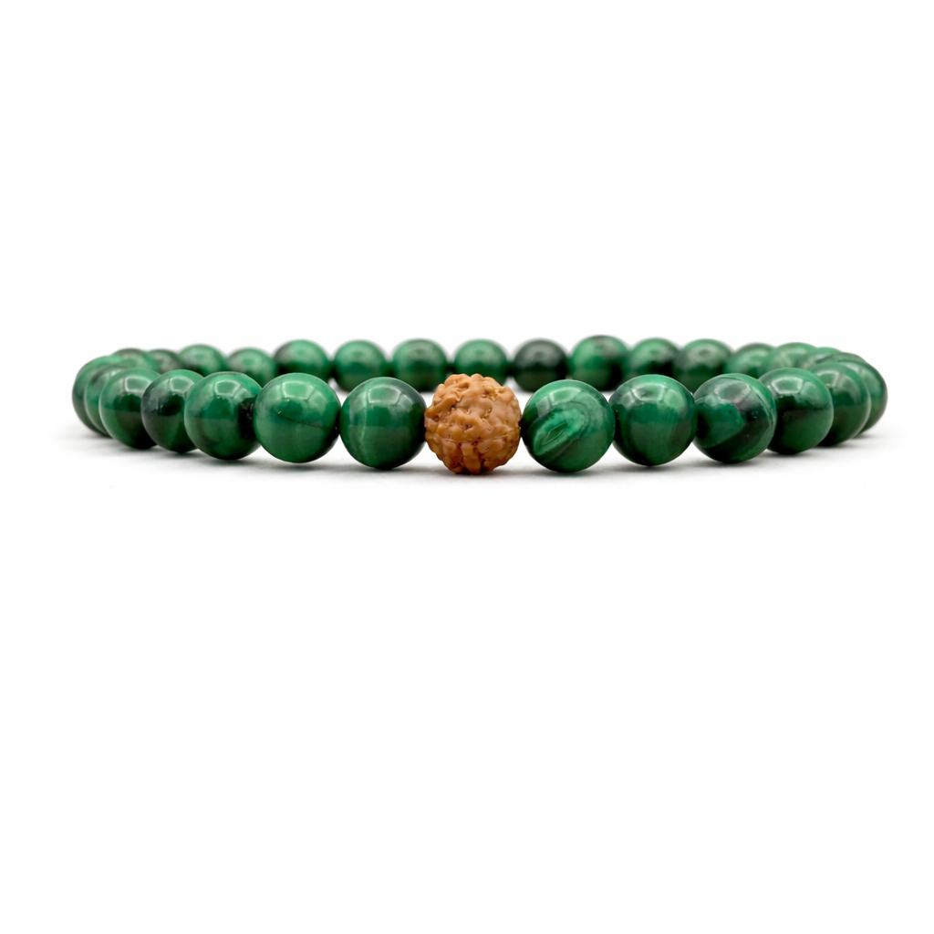6mm armband met Malachiet en een Rudraksha zaadje. Malachiet is een Halfedelsteen die verzorgd moet worden, daar deze steen poreus is, kan ze heel snel mat worden. Malachiet houdt niet van water, detergenten etc. Rudraksha is een bidsteen die in India zeer geliefd is. Ze geeft ook kracht en zelfvertrouwen aan de drager.