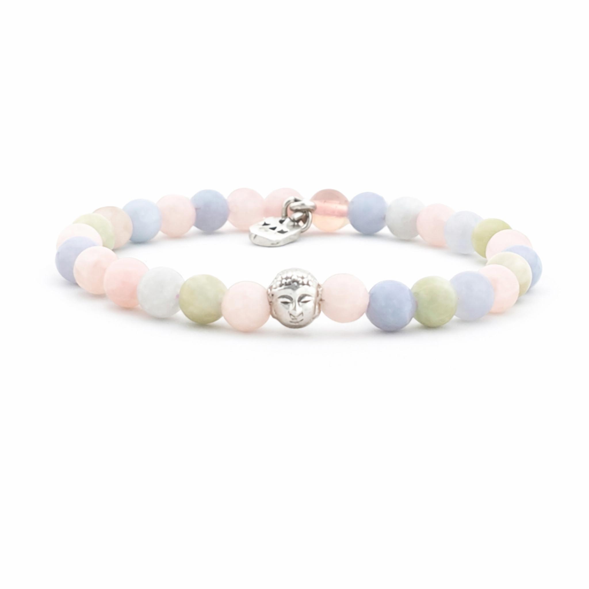 6mm armband in Morganiet, een prachtige Halfedelsteen, gecombineerd met een mini Buddha. Morganiet geeft je rust gedurende drukke en moeilijke periodes. verlaagt ook de druk om te presteren en helpt om te ontstressen.